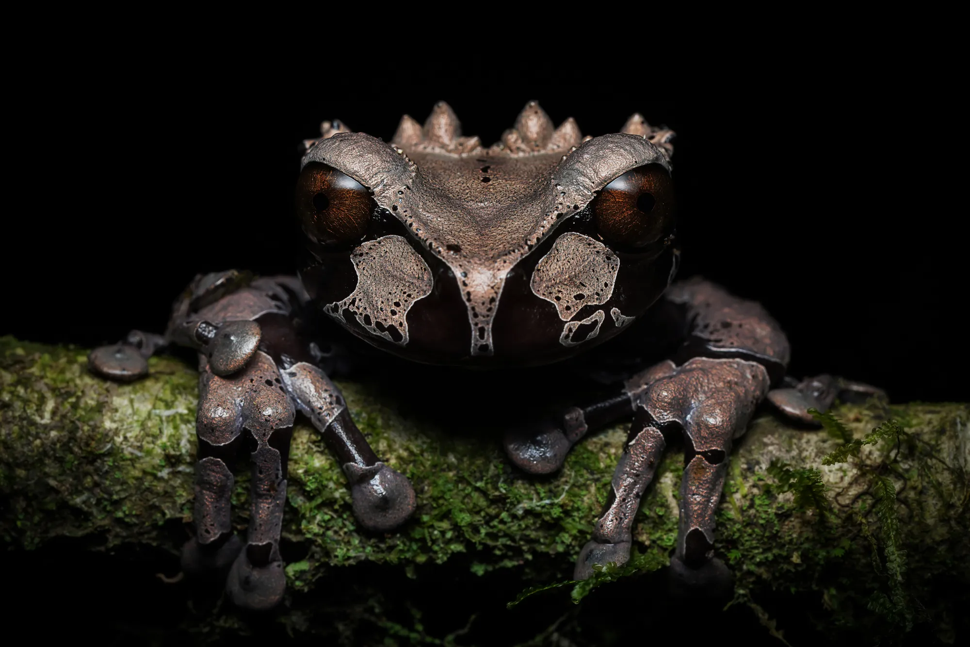 On a night walk that I did in September, in Guapiles, Costa Rica, we came across this jewel of the rainforest: a crowned tree frog. It seemed as if it was made of chocolate – and if you look closer, it has a beautiful crown. The symmetry on its head is just perfect.