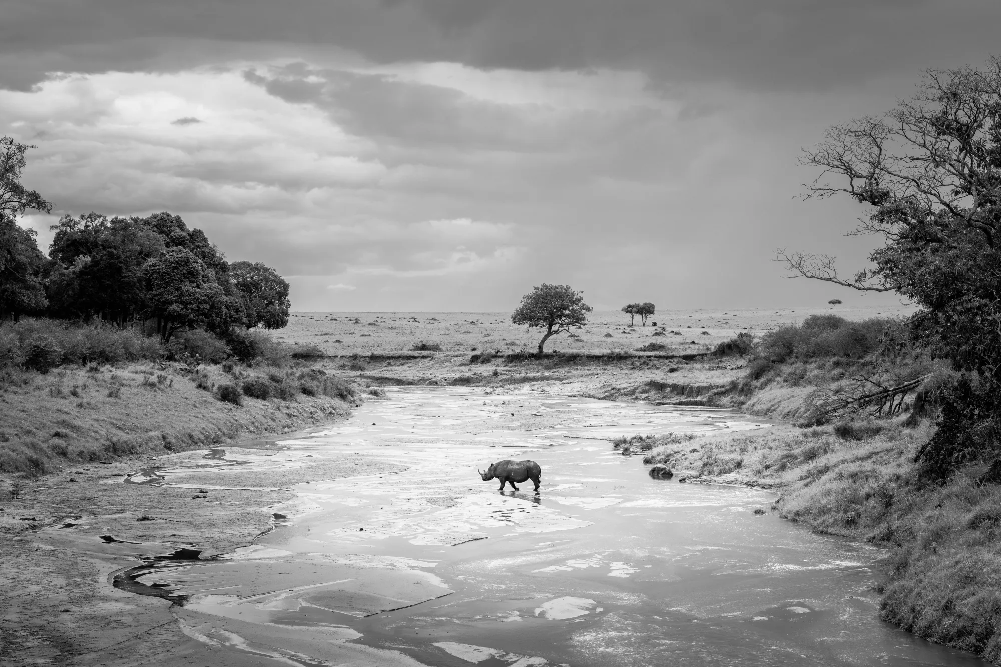 At Sand River in Kenya’s Maasai Mara, the remnants of the migration suddenly turned back. From the opposite bank, a black rhino emerged and began to cross the river alone. Watching such an elusive animal take a path usually shaped by the herds was an unexpected moment for the photographer.