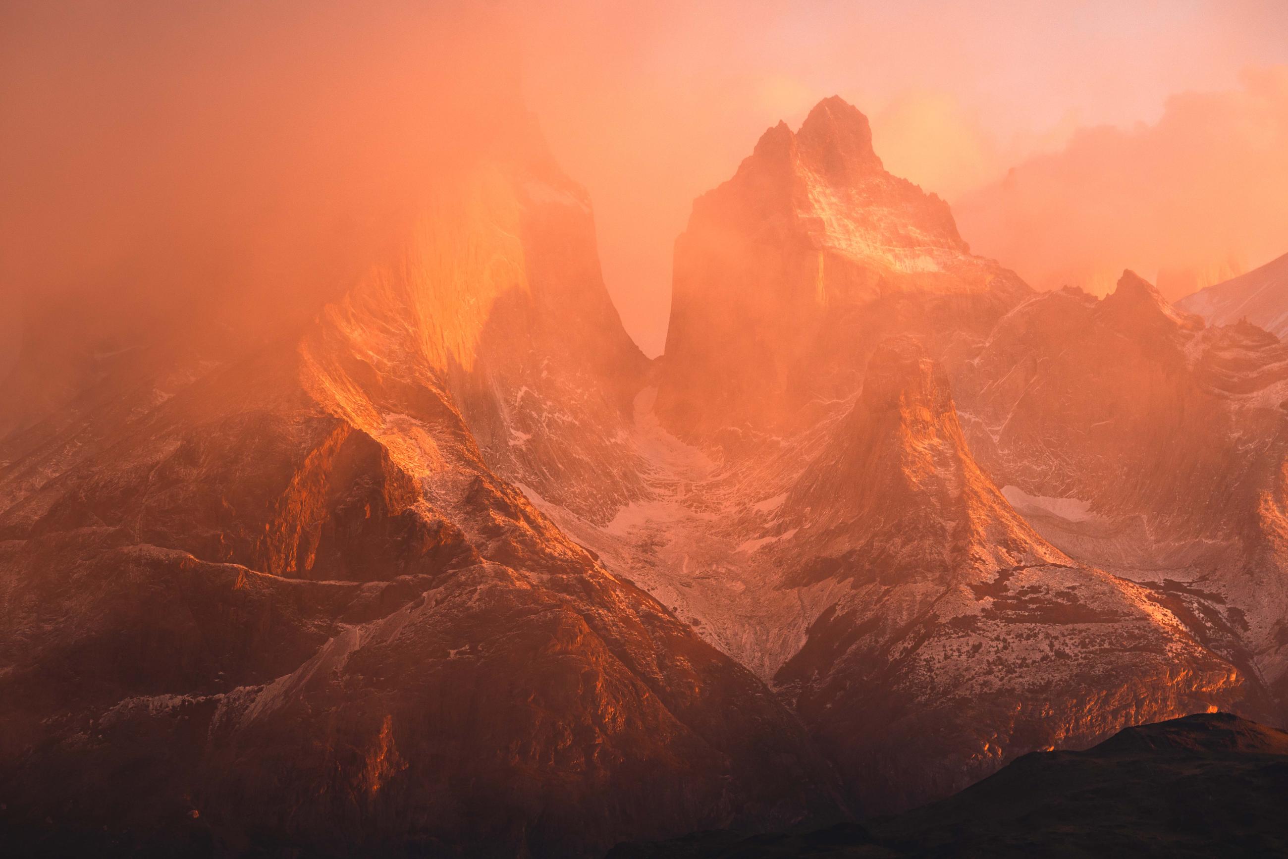 Sunrise over the Torres del Paine peaks in Chile’s Patagonia region.
