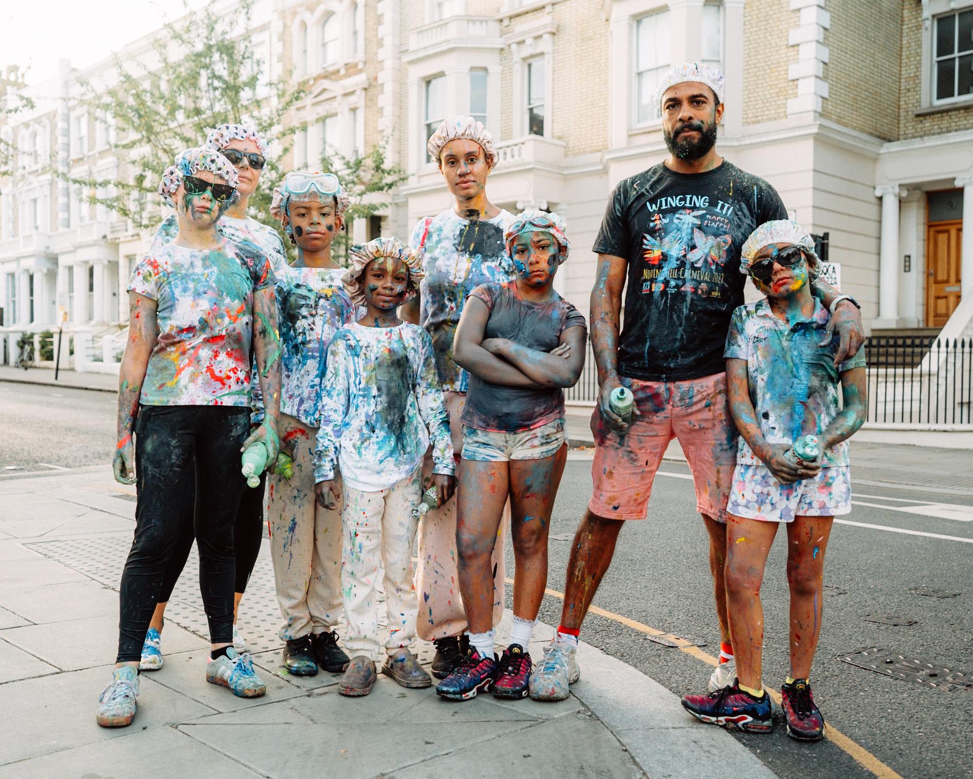 A family photographed at the end of J'ouvert, the early-morning opening ceremony of London’s Notting Hill carnival, where colourful powder and paint are thrown at one another. This family was heading to sleep, as they planned to rejoin the carnival later in the day.