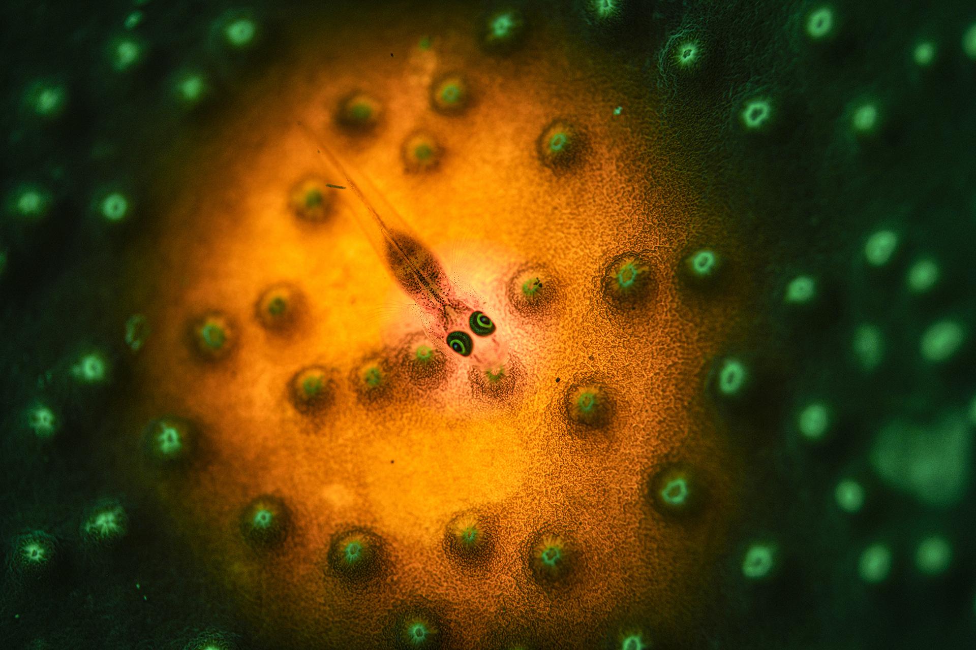 A small green-eyed goby camouflages itself on a coral with numerous fluorescent green protrusions. It creates a pattern of tiny green lights, like many small glowing eyes.