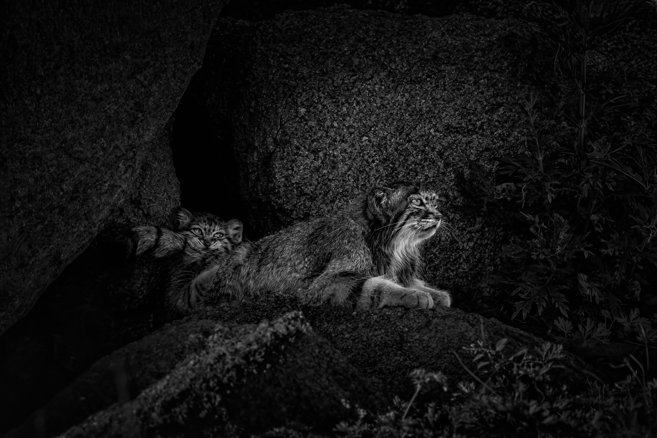 Not long after the kittens’ morning play, the mother Pallas’s cat returned with a rodent. The first youngster to reach her claimed the prize, while the slower siblings lingered nearby. Whenever the mother paused to rest, their mischief shifted toward her instead. In this frame, the youngster’s bright, mischievous eyes reveal a personality beginning to emerge.