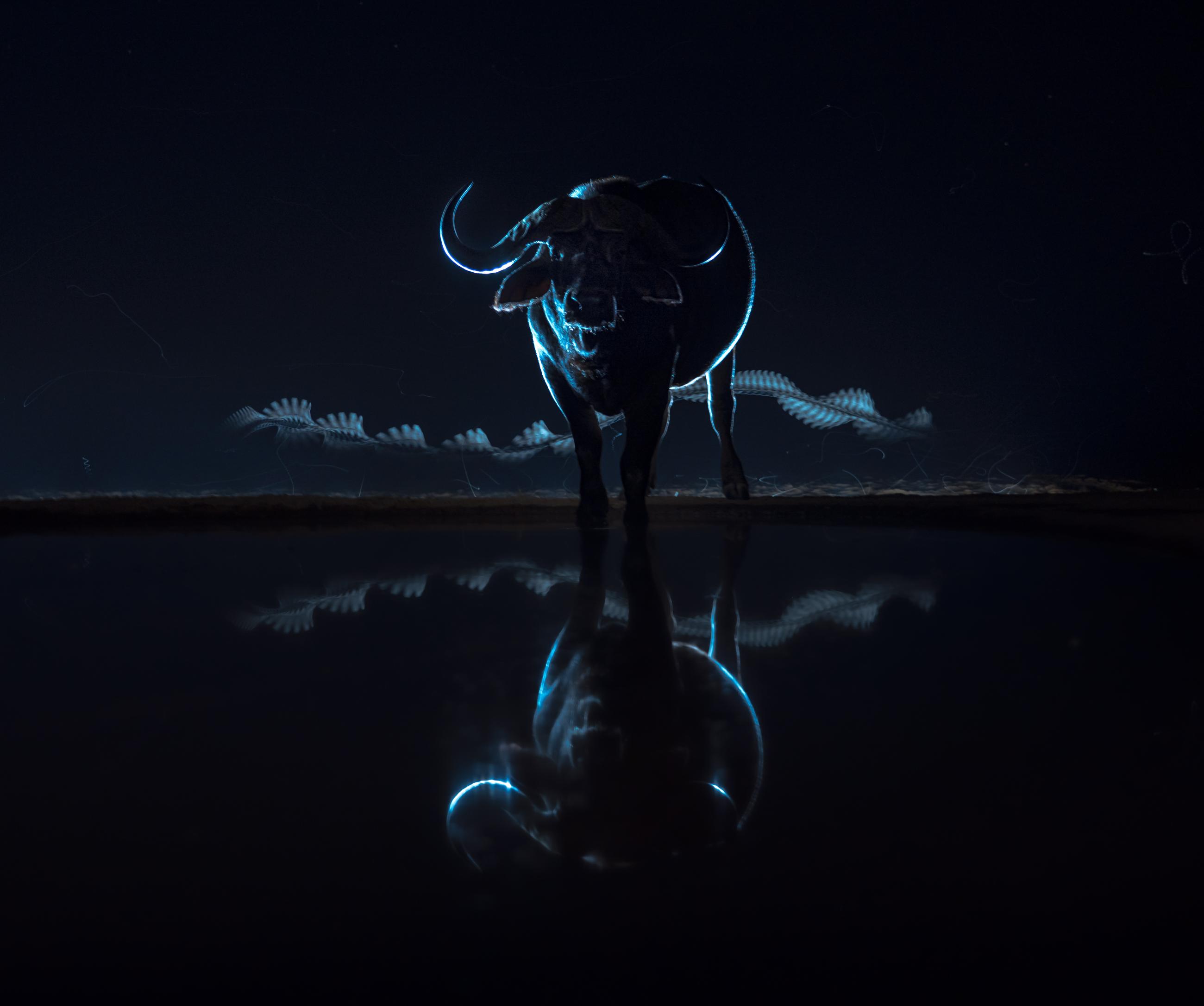 The photographer waited patiently until this African buffalo was reflected in the dark water, the intense backlight transforming it into a glowing silhouette and highlighting the curve of its horns. The slow shutter speed also captured a bat fluttering across the scene, its flight appearing as a ghostly ribbon-like pattern.