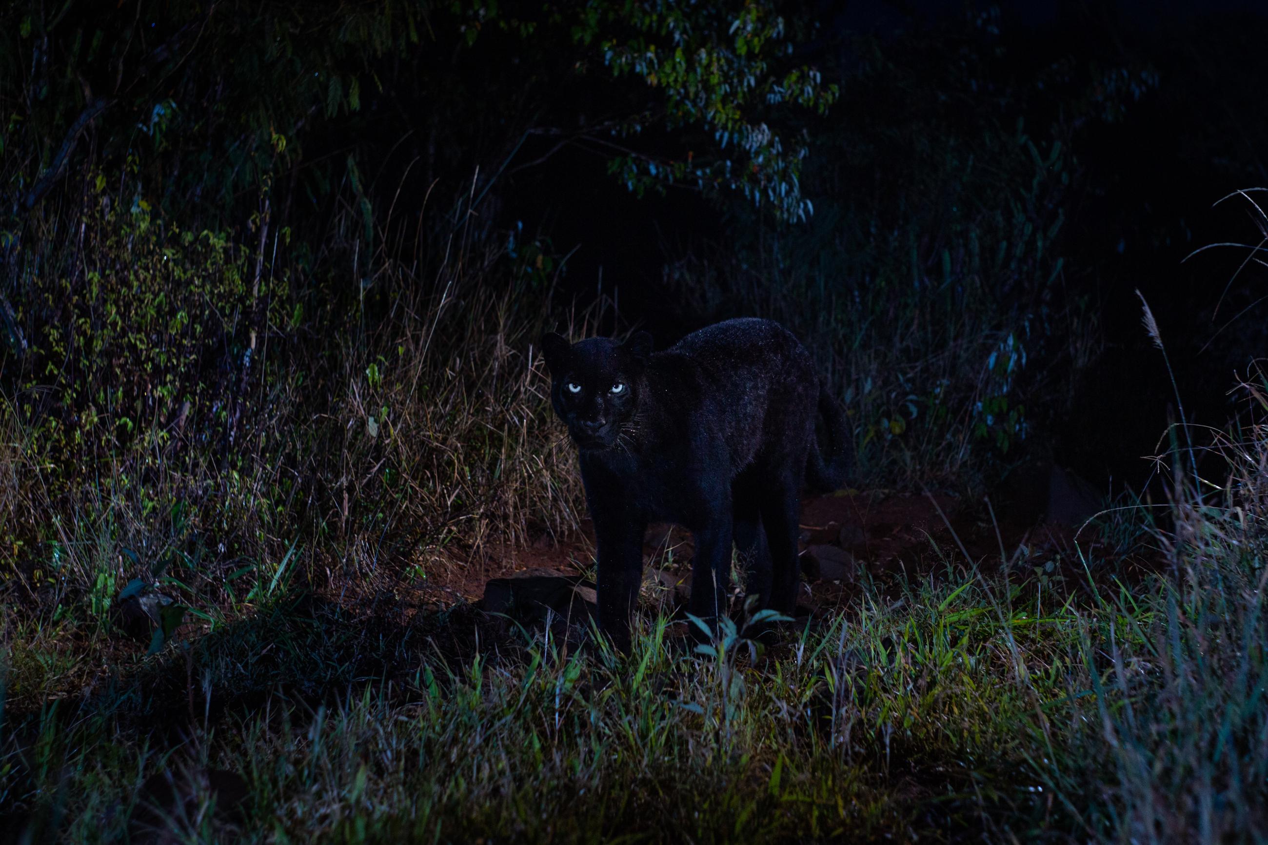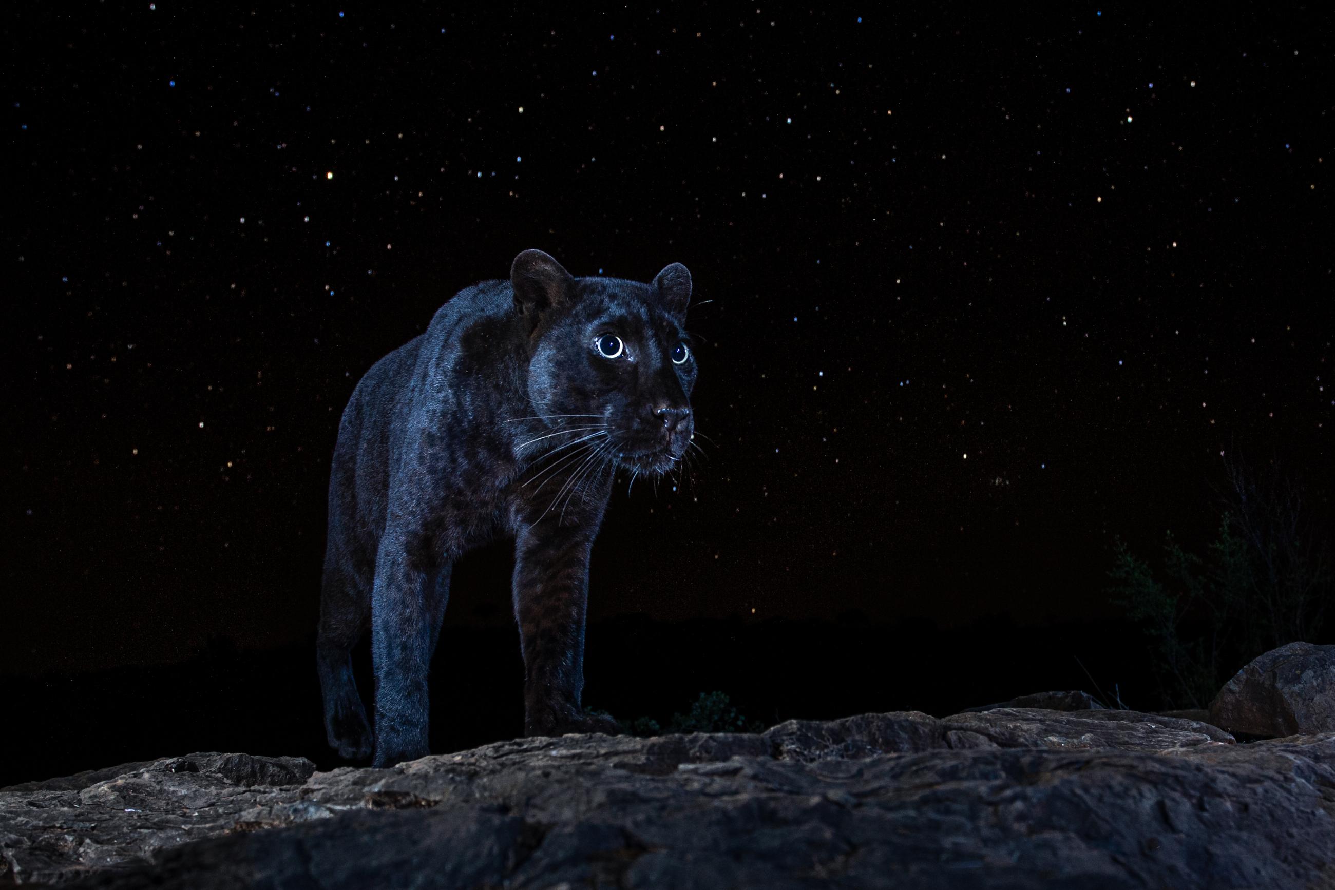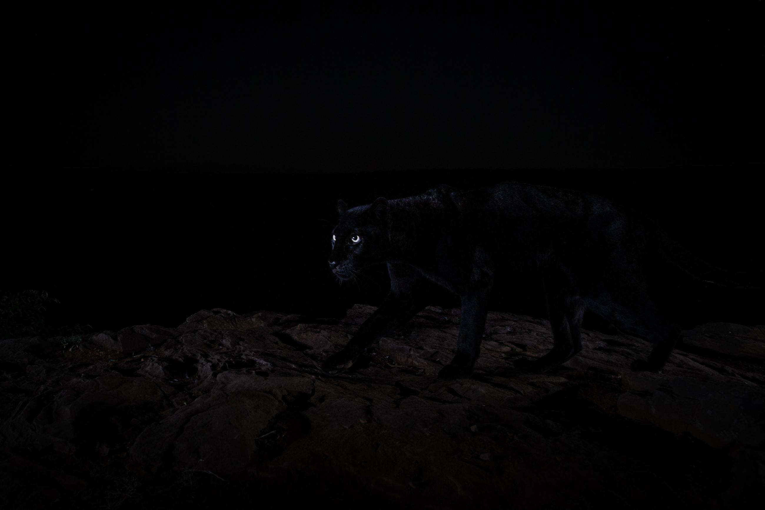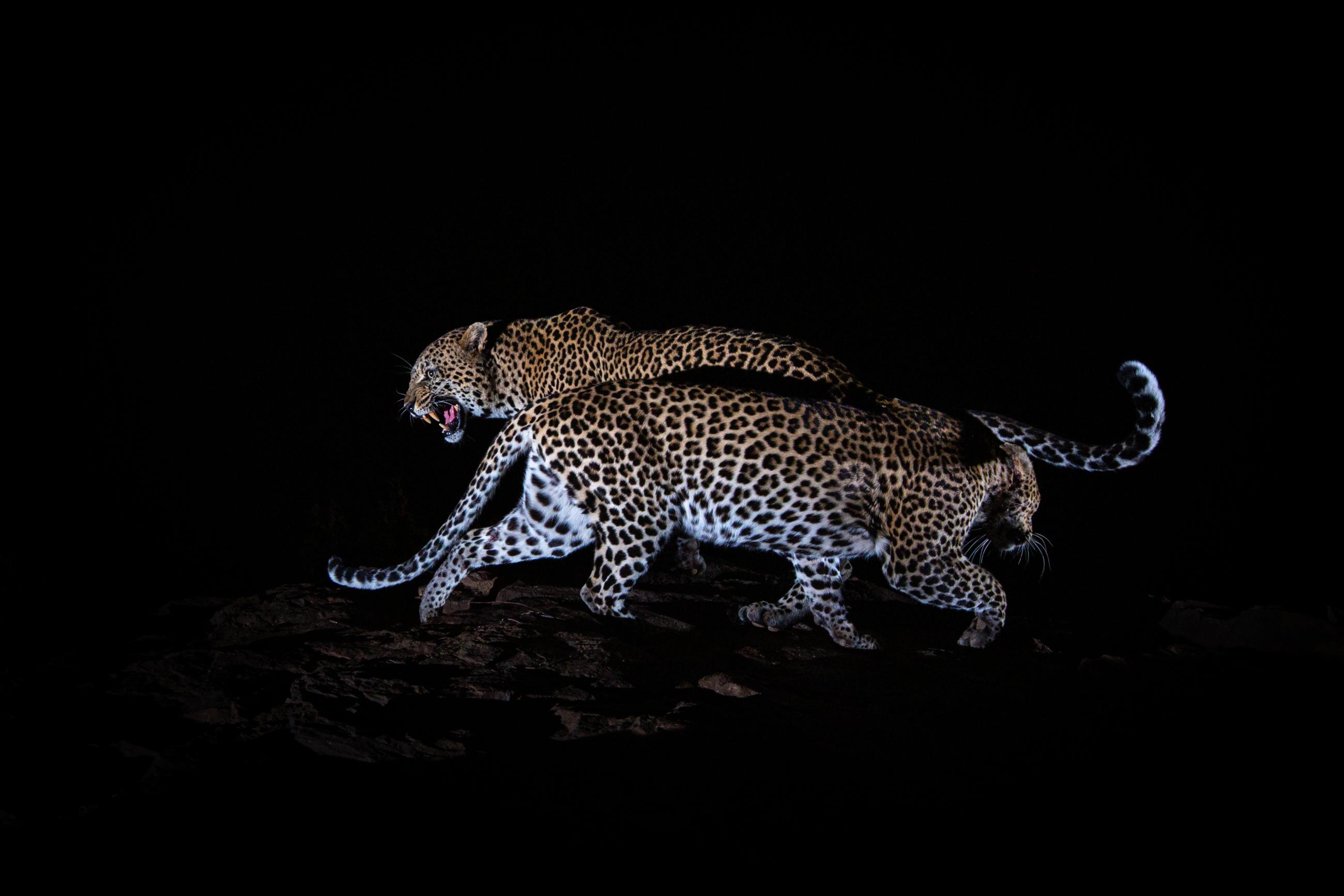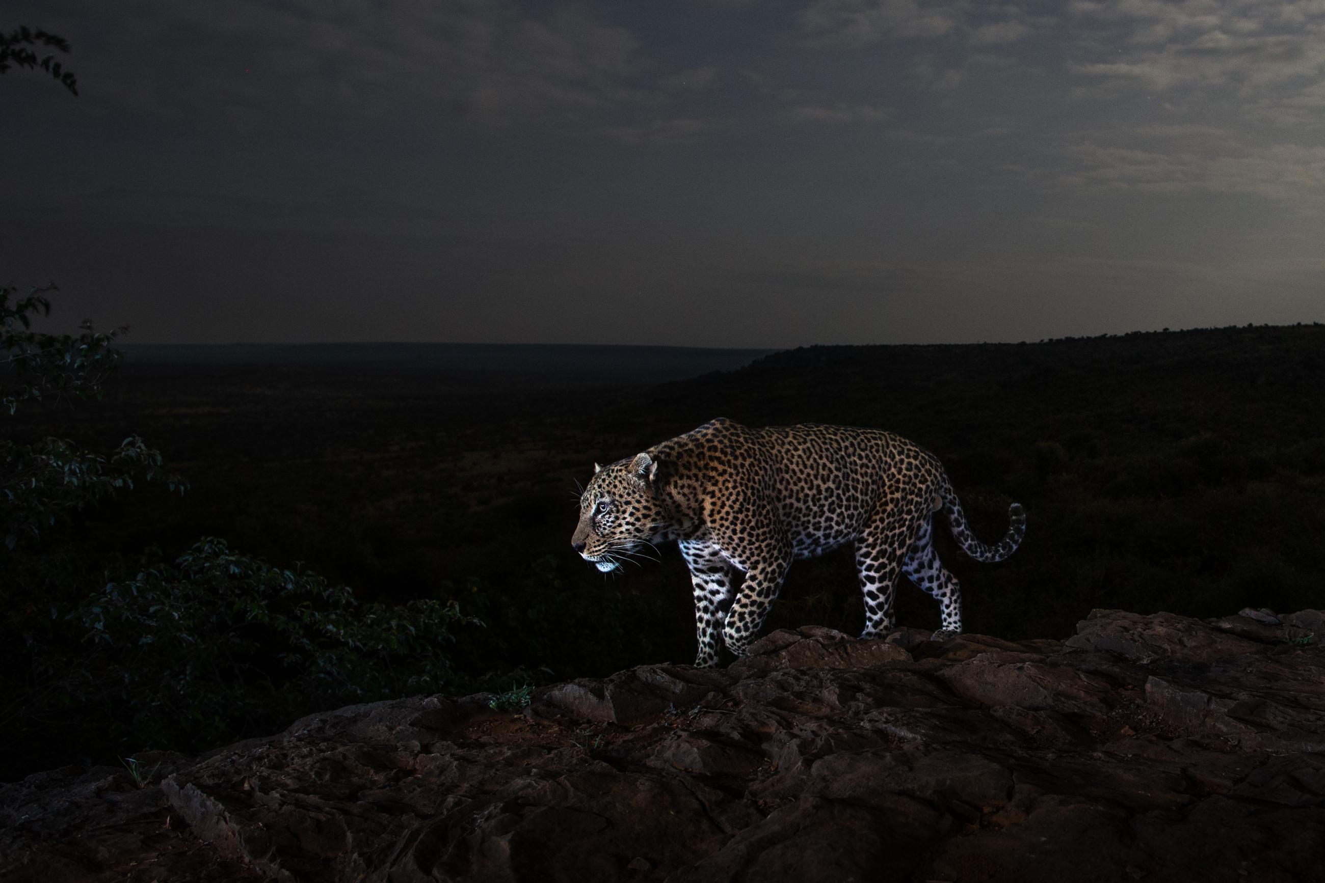 I spent more than a year photographing leopards in Kenya's Laikipia County. All images were taken using a high-quality camera trap system that I developed myself for photographing elusive and nocturnal wildlife. One of the leopards in this area is a very rare melanistic individual – a black panther. Prior to this project, a black leopard had not been scientifically documented in Africa for more than 100 years. The normal ‘spotty’ leopards shown in this series are thought to be the parents of the black leopard. Working exclusively at night allowed me to get creative with lighting. In some images, I used dramatic, studio-like lighting, while in others I balanced my flash with ambient moonlight or even exposed stars in the night sky. Working with such an unusual black animal in the black of night was both a great challenge and a wonderful opportunity to experiment with light.